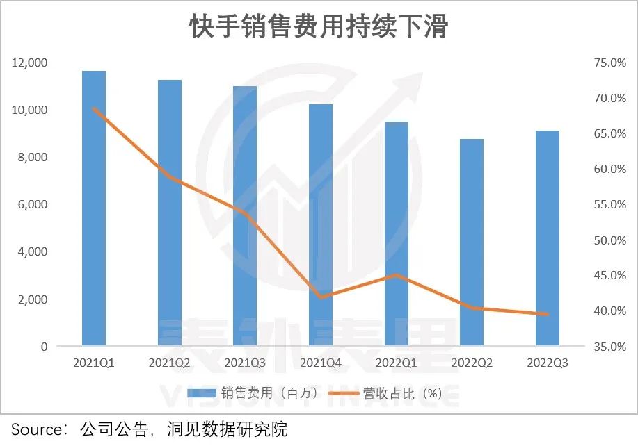 在互联网哀鸿遍野下,快手的毛利率连续两个季度大幅度提升,2022Q3为46.3%,达到上市后最高。