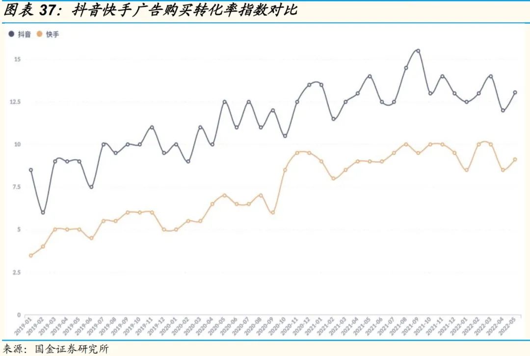 快手/抖音广告的购买转化率持续提升。其中,2019年1月-2022年5月来说,转化率指数提升257%。抖音也是类似。