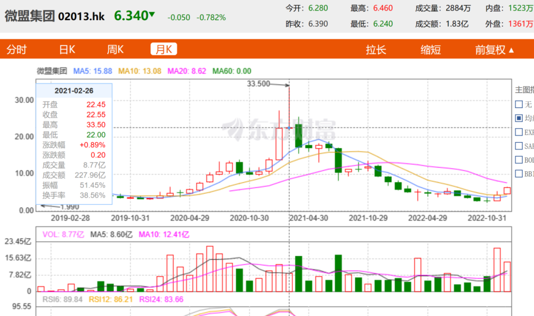 在9个月前的3月29日,微盟股价为5.45港元/每股,现今市值增加22.7亿港元,但距2021年2月26日最高点的33.50港元/每股,却依然有81.1%的下跌,市值蒸发了692.3亿港元。