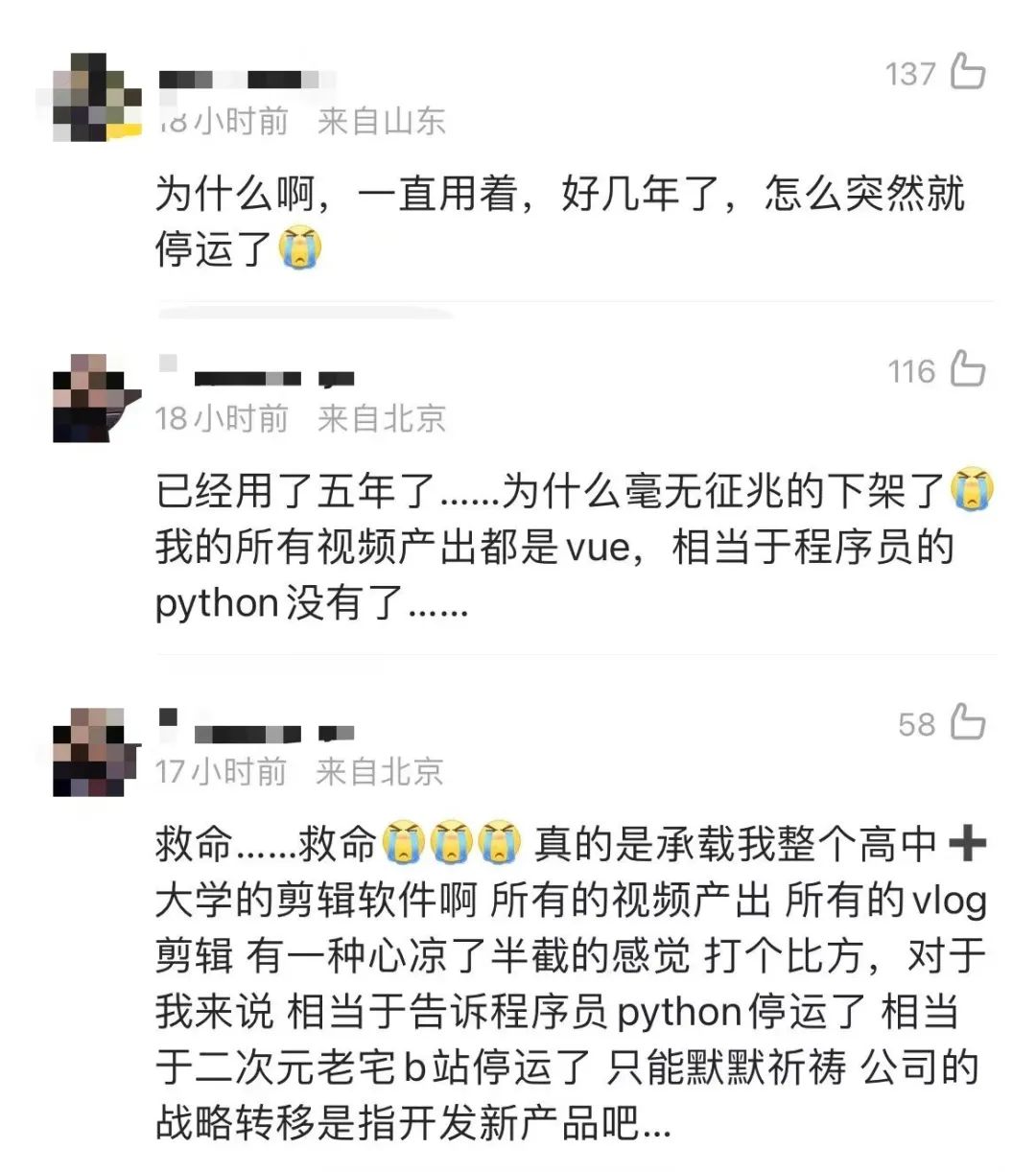 事实上,近几年抖音、B站等短视频平台相继推出免费的剪辑工具,更加挤压了VUE的生存空间。VUE无论是在工具上还是社区上,都不再具有突破的可能。它的停运是意料之中的。