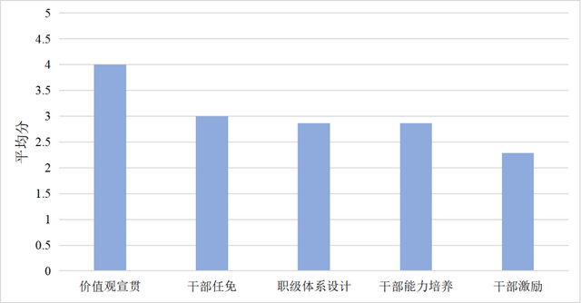 我们的调研结果显示,“价值观宣贯”高居榜首,达4分,远高于排名第二、得3分的“干部任免”。而印象中应该被重视的“干部激励”则关注度最低,仅为2.29分。按照这个数据,我们基本可以确认,民营企业需要的干部管理实际上就是“以干部任免来支撑的价值观宣贯”。进一步看,老板们默认对于干部的任免就是一种最大的激励,对于激励机制的单独雕琢并没有太大的兴趣。