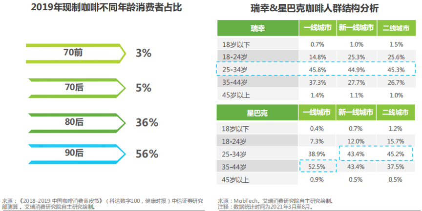 据艾瑞咨询的数据,2019年现磨咖啡消费占比中,90后占56%。而在一线城市中,瑞幸的主要用户年龄为25-34岁,占比45.8%;星巴克的主要用户年龄为35-44岁占比52.5%。