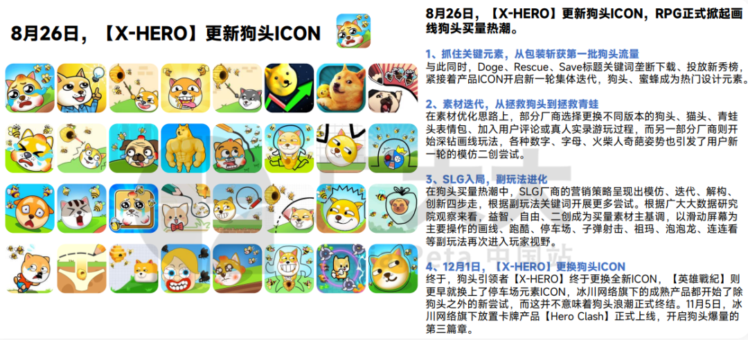 以“副玩法买量”举例,就有MiniGame结合买量素材,引领副玩法爆量营销;【X-HERO】更新狗头ICON,RPG掀起画线狗头买量热潮;Funplus用“子弹”创意激起新风浪......