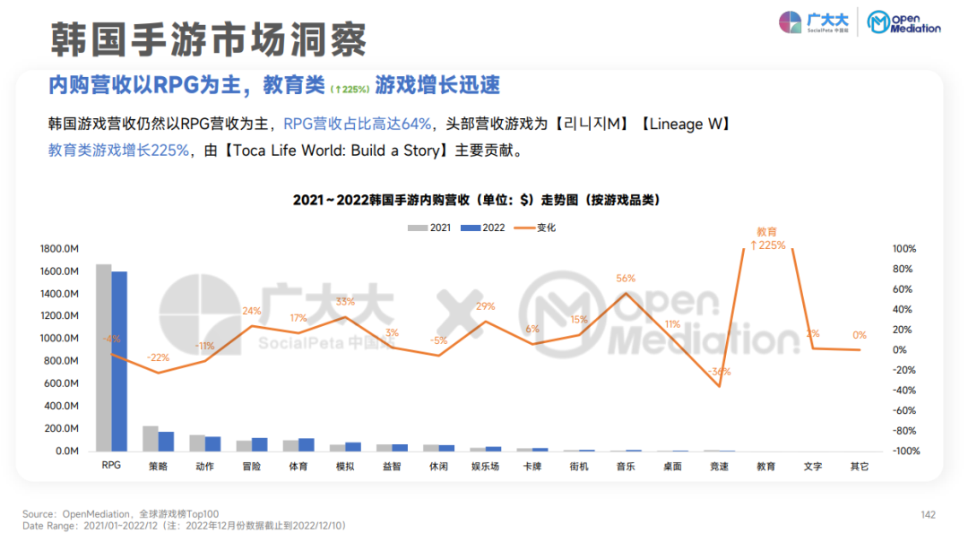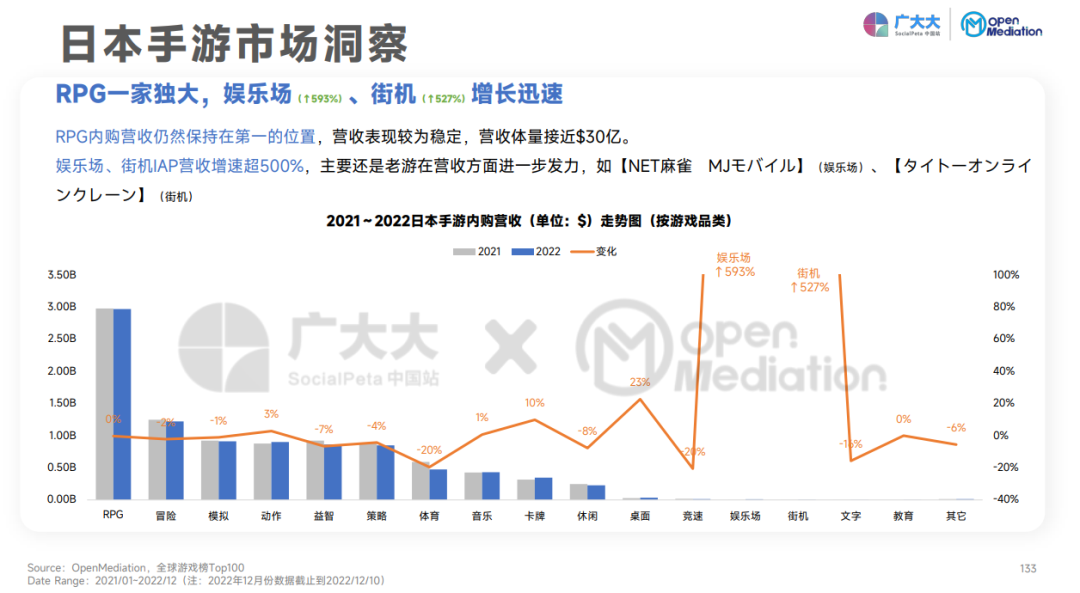 - 日、美、韩依然是手游营收的主要地区。益智、RPG、娱乐场、休闲四个品类在美国均实现不同程度的营收增长;娱乐场、街机在日本的IAP营收增速超500%,非常值得关注;RPG则在韩国市场保持“营收主力”的地位。