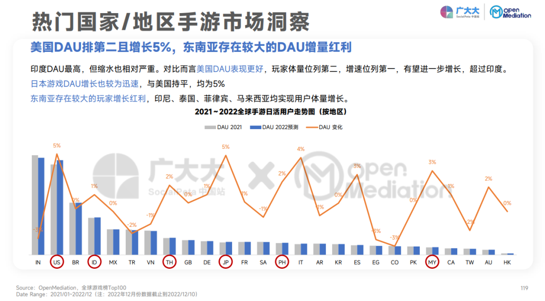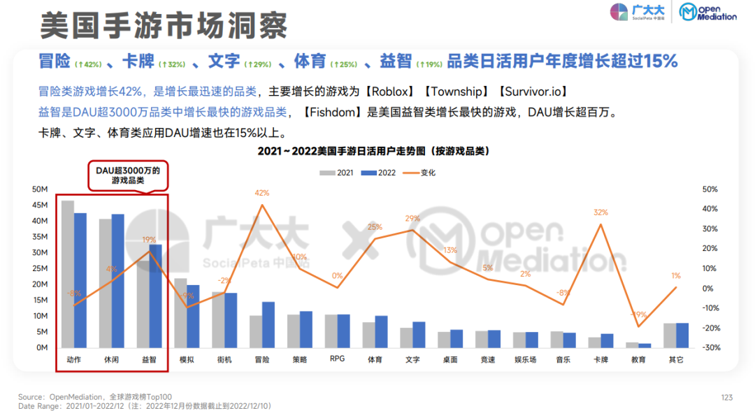 正如罗斯基所分享的:“2022年的全球游戏市场在总量规模上出现了下跌,这预示着未来几年的行业产品竞争会越发激烈。不过中国游戏在海外市场的营收占比在今年达到了35%,再次刷新历史新高。这也说明游戏出海依旧是大势所趋......相比于头部老牌出海团队的高举高打以及重度化产品。中小团队在游戏全球化的趋势下,也在逐步把自己的产品发行到海外市场,如休闲益智、 模拟经营、合成放置等几个类型将会有突出表现。但随着市场竞争的激烈,大家都在寻找产品玩法上的融合以及用户圈层的突破。海外的主要游戏市场乃至全球市场增长放缓以至微跌,特别是美国、日本、韩国都出现不同程度的同比或是环比下降。在这些游戏出海的成熟市场及地区,未来的竞争加剧可想而知。”
