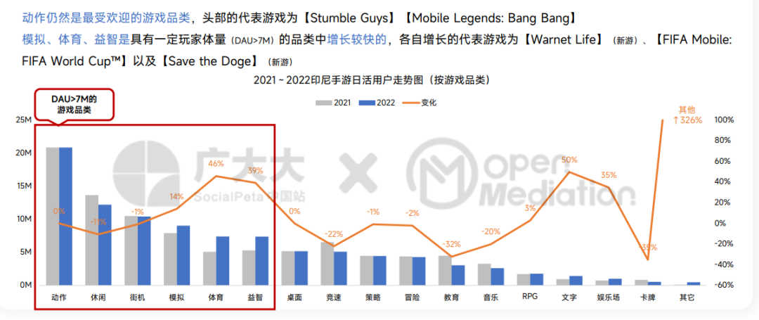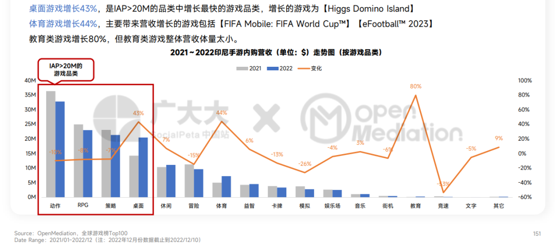 - 东南亚存在较大的DAU增量红利,印尼、泰国、菲律宾、马来西亚均实现高于全球均速的增长。其中,印尼模拟(↑14%)、体育(↑46%) 、益智(↑39%)三个品类用户增长较快;桌面、体育两个品类内购营收增速较快,分别增长43%、44%。