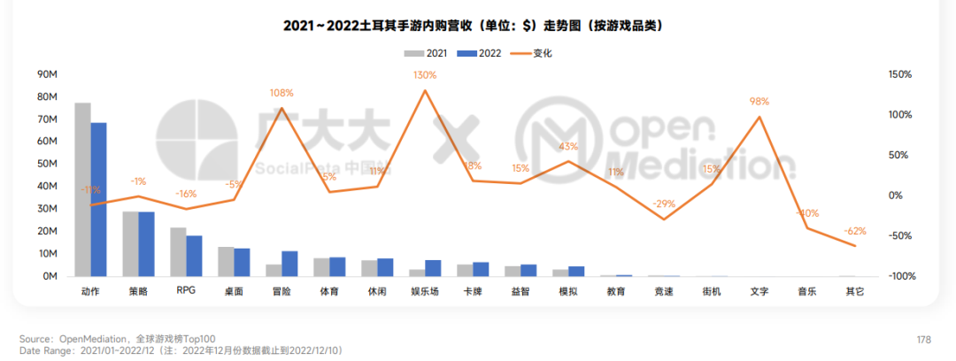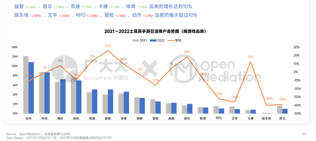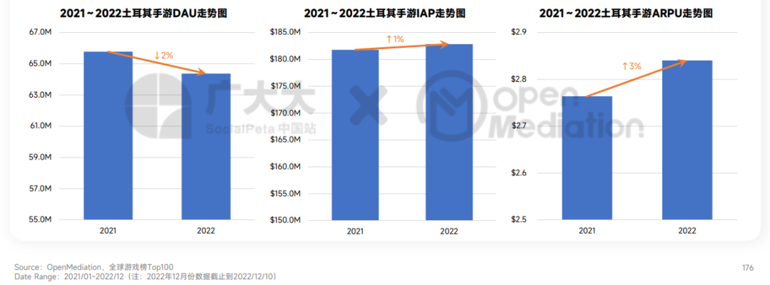 - 全球仅土耳其手游内购营收实现1%的小幅增长,其他地区均呈现不同幅度的缩水。在土耳其,ARPU逆势增长3%,带动了IAP营收的上涨。益智(↑26%)、音乐(↑18%)、竞速(↑13%)、卡牌(↑12%)、体育(↑10%)品类的DAU增长达到或超过10%;冒险、娱乐场两个品类均实现超100%的增收,【Pokémon GO】(冒险)、【Roblox】(冒险)、【Jackpot Magic Slots】(娱乐场)、【Big Fish Casino - Social Slots】(娱乐场)等游戏快速发力。