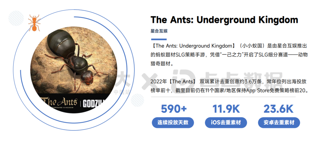 其一,像休闲、益智解谜、Casino、模拟经营、4X SLG这样本身就拥有广泛用户基础的品类,更需要精品,长期深耕的空间也更大。这也就不难理解2022年出现了很多老牌游戏玩法“翻红”的例子,比如用“割草”玩法翻新“休闲Rouguelike”的《Survivor!.io》,以及用“蚂蚁题材”来翻红4X SLG的《The Ants》。