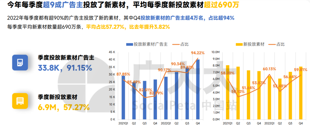 先看一组数据,全球各地Top200游戏榜的DAU全年增长仅1%,IAP还缩水(-1%),在这种情况下,仍有厂商实现快速增长。另外一组数据是,今年游戏广告投放季度均广告主数量同比提升17.5%,季度素材却同比减少近16%;每季度有超9成广告主投放了新素材,平均每季度新投放素材量比去年提升3.82%,广告素材正在朝着“少而精”发力,且有更多广告主参与到这种“少而精”的竞争中。