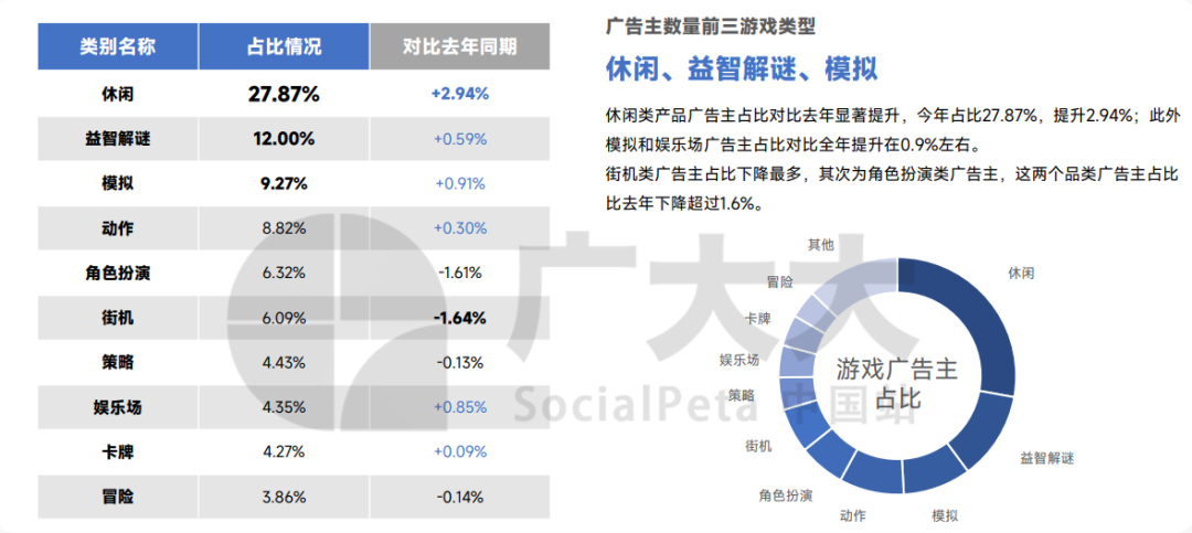 数据印证了这一点,2022年休闲类广告主同比2021年提升2.94%,同时,休闲类素材总计占比22.69%,比去年提升4.74%,依然位居首位;益智解谜游戏的综合表现其次,广告主占比仅次于休闲游戏,广告素材则同比提升0.59%;模拟和娱乐场(Casino)广告主则增长0.9%左右,前者的广告素材同比去年提升近1%,后者则几乎保持着和去年一样的水平。