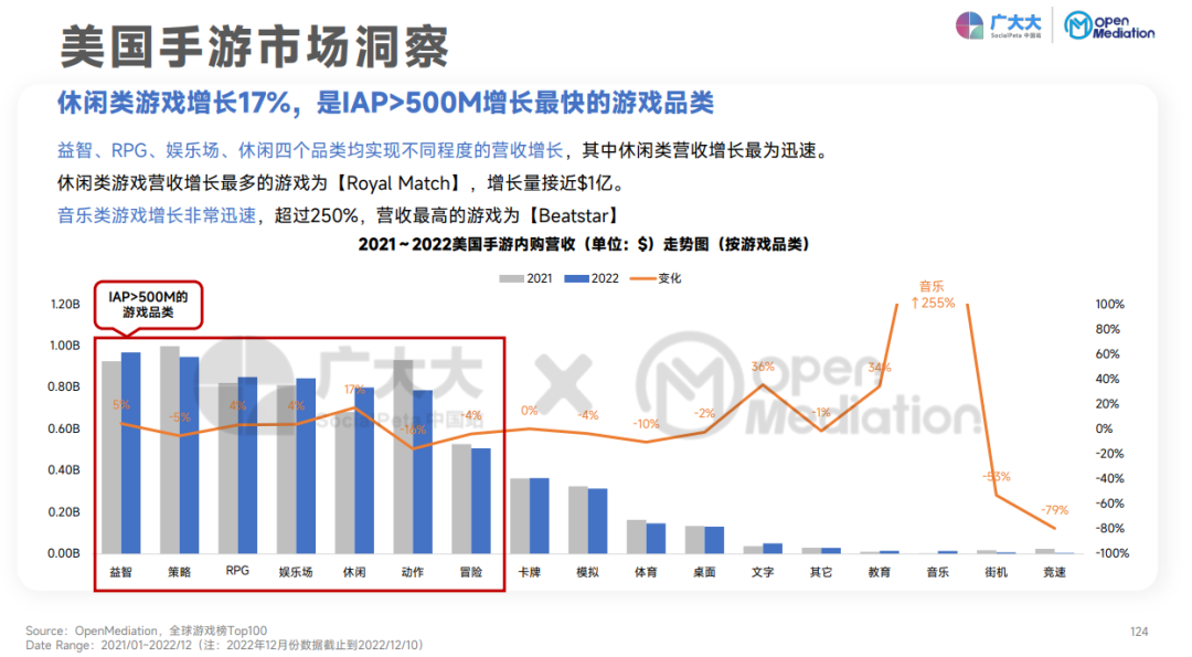 然后,继续深化混合变现,比如微光互动,在保持不太重的玩法、IAA变现的同时,于成熟市场的IAP探索也进展很好。再比如,越来越多的超休闲游戏在IAA之上通过玩法迭代,尝试不同的IAP结合思路,以至于超休闲的IAP在2022年实现了较大增长,超休闲也从一个“仅依靠快速推出新游”的模式走上更长线的游戏化发展道路。