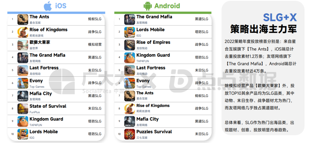 在手游出海的二十年历程中,早期画下浓墨重彩一笔的就是4X SLG游戏,先有首款“出海转内销”的《COK(列王的纷争)》,激起“COK-like”游戏出海热潮,然后又陆续有《率土之滨》、《王国纪元》、《火枪纪元》、《阿瓦隆之王》、《Last Shelter: Survival》、《Game of Sultans》等,2022年,本以为爆款凋零的出海赛道却又杀出了动物题材的创新SLG产品《The Ants: Underground Kingdom(小小蚁国)》、《Wolf Game: The Wild Kingdom》(今年出海无爆款?SLG演绎疯狂动物城),证明了深耕传统赛道的价值。