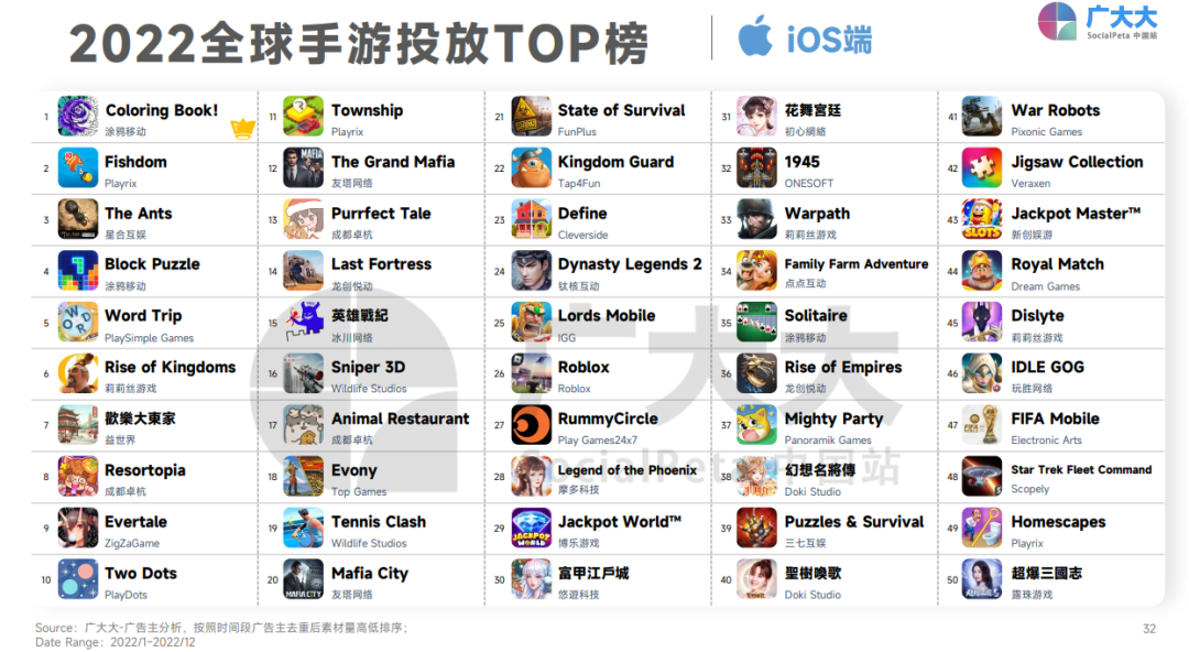 其三,中国出海厂商占据全球TOP投放榜近4成,中国出海保持着持续性的影响力(2022年中国游戏出海都有哪些重大表现?)。