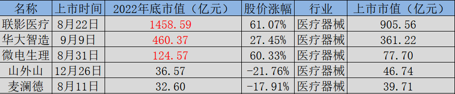 这个细分版块的最大特点就是上市的公司多为细分行业龙头。在5家2022年科创板上市的医药器械公司中,有4家是细分行业龙头:医疗影像设备龙头联影医疗、基因测序设备龙头华大智造、电生理设备龙头微电生理、血液透析机龙头山外山。