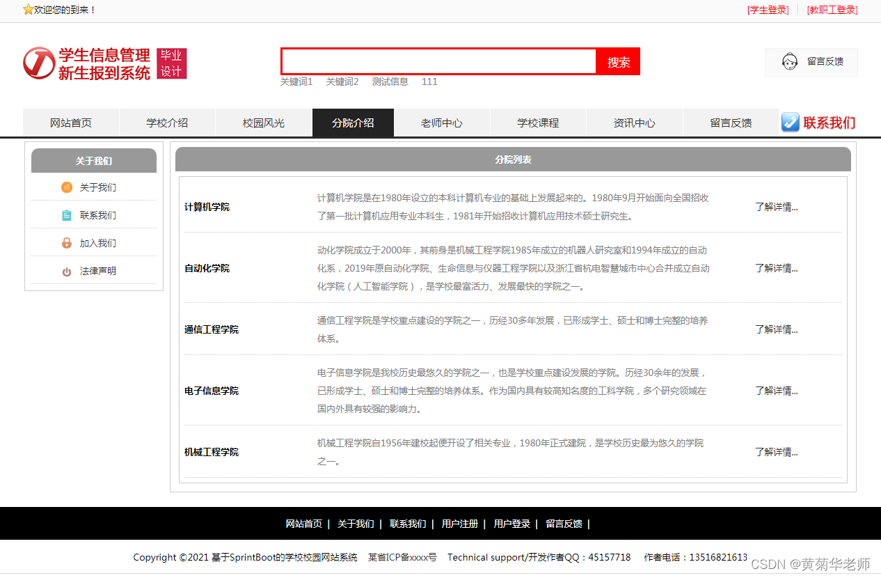 分院介绍:列出学校所有分院、可以点击查看详情查看