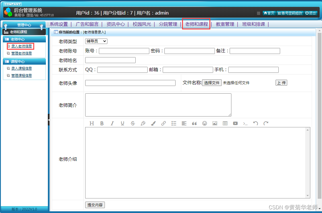 老师录入:录入老师姓名、联系方式、头像、老师简介