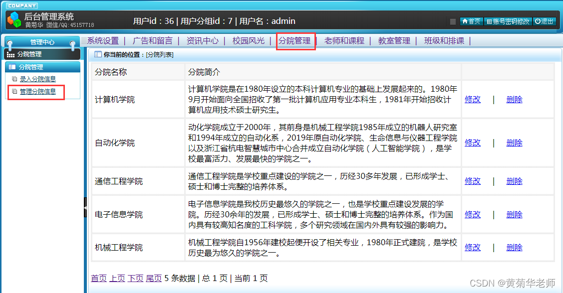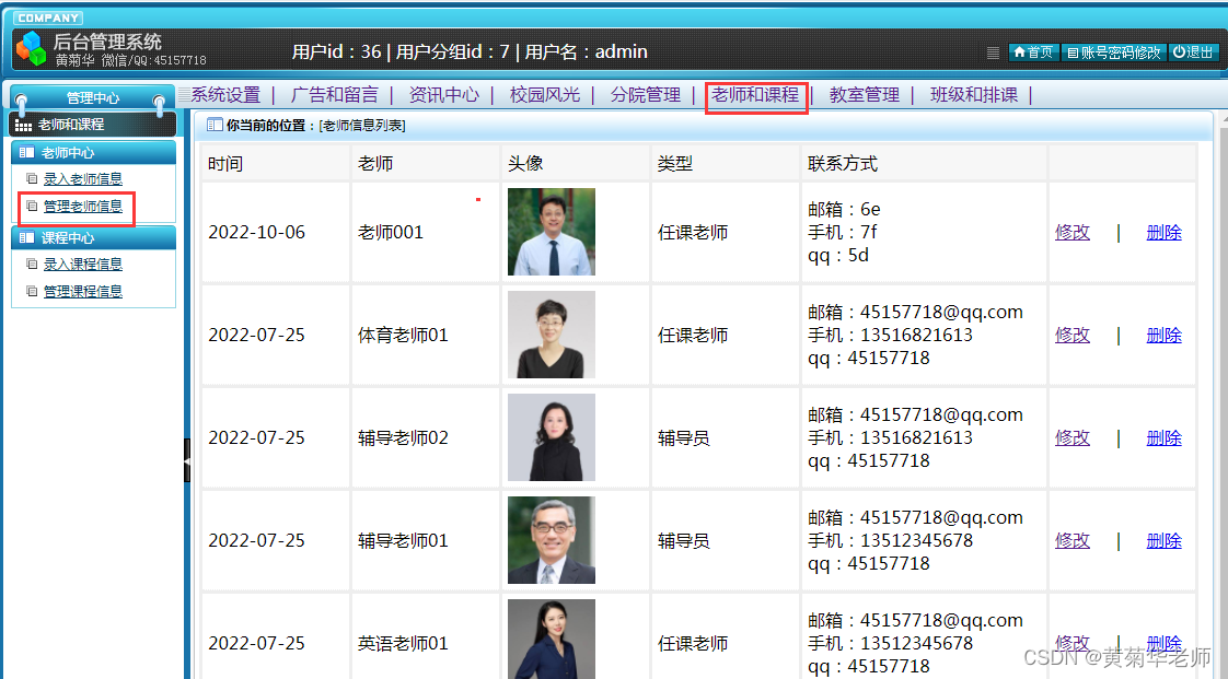 老师管理:管理所有已经录入老师信息,支持修改和删除