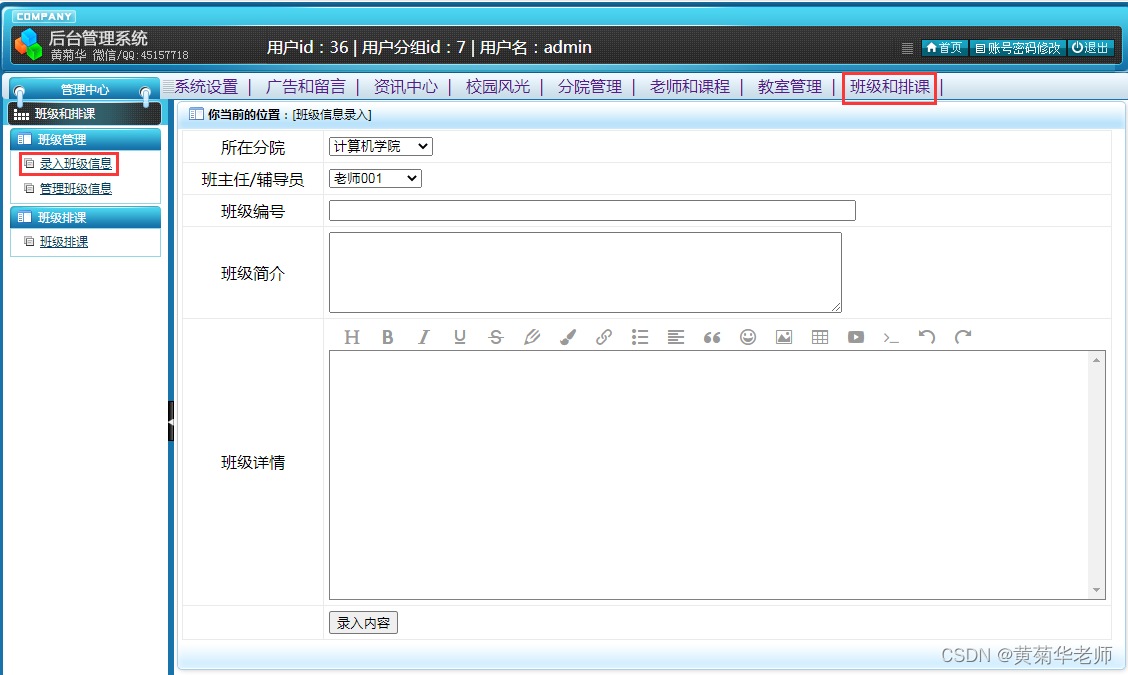 班级录入:录入班级编号、选择分院、选择班主任、录入简介和班级信息