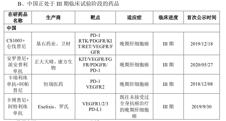 除了面临诸多产品的激烈竞争外,一些针对晚期肝细胞癌一线治疗的创新靶向疗法正处于临床开发过程中,国内亦有药企布局,包括帕博利珠单抗、卡瑞利珠单抗联合阿帕替尼或化疗、替雷利珠单抗和阿特珠单抗联合贝伐珠单抗等。
