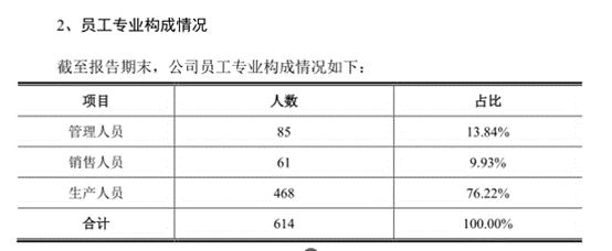 从员工架构上看,截至2021年末,元创股份共拥有614名员工,其中85名管理人员、61名销售人员、468名生产人员,公司似乎没有研发人员和技术人员。