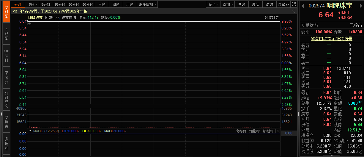 交易行情显示,明牌珠宝2月6日早盘开盘就冲上“一”字涨停板,至当日收盘,明牌珠宝维持“一”字横盘模式。据东方财富显示,2月6日明牌珠宝收涨9.93%,收报6.64元/股,最新总市值为35.06亿元。这也是明牌珠宝兔年来收获的首个涨停板。
