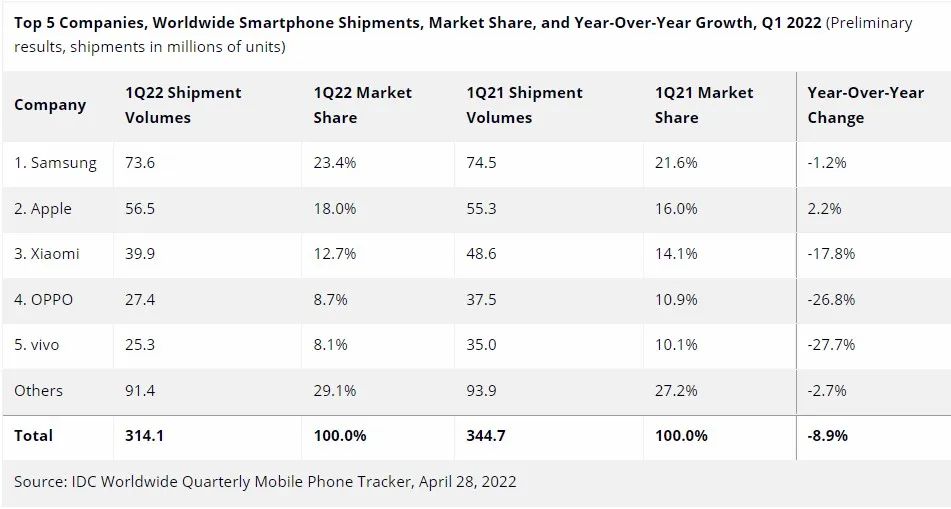 (IDC,2022 Q1全球智能手机市场各品出货量与市占率)