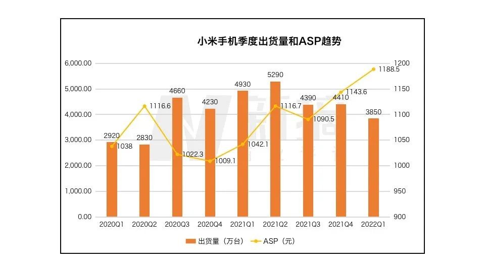 2022年第一季度小米智能手机平均售价(ASP)1189元,同比增长14.1%,但与vivo的1634元和OPPO的1587元相比,还是有数百元的差距,与苹果5200元的均价更是相差甚远。