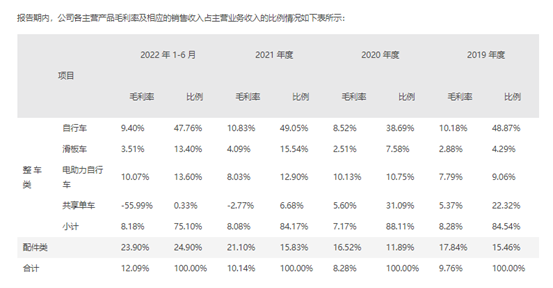 对此,永祺车业解释称,公司主要通过对客供以及其他外购的原材料和配件进行组装加工形成共享单车。公司于2021年调整业务结构,减少共享单车出货量,共享单车单价较低且利润低,从而分摊制造费用、人工成本偏高,造成毛利为负,2022年上半年出货量较小,故成本分摊制造费用较多,毛利率下降较多。