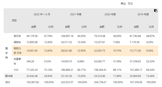2019年-2021年以及2022年上半年(以下称“报告期内”),永祺车业的自行车业务分别实现收入8.18亿元、7.92亿元、10.89亿元和4.92亿元,占主营业务收入的比例分别为48.87%、38.69%、49.05%和47.76%,是公司主营业务收入的最重要来源。