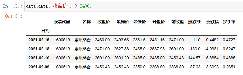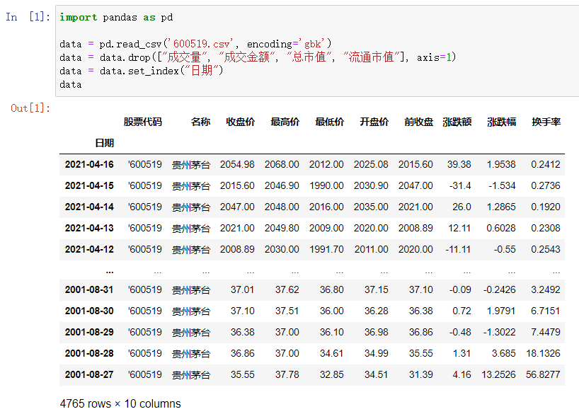 数据文件是600519.csv,将此文件放到代码同级目录下,从文件中读取出数据。