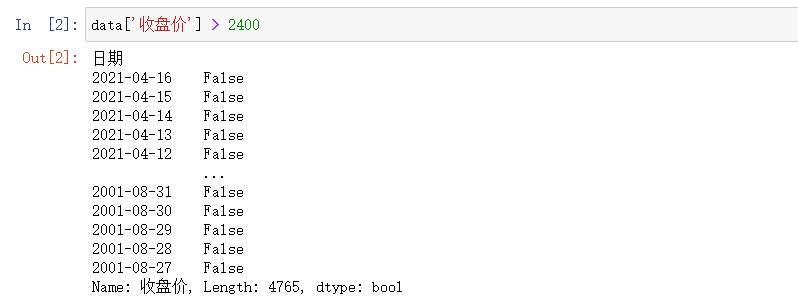 在Pandas中,将Series与数值进行比较,会得到一个与自身形状相同且全为布尔值的Series,每个位置的布尔值对应该位置的比较结果。