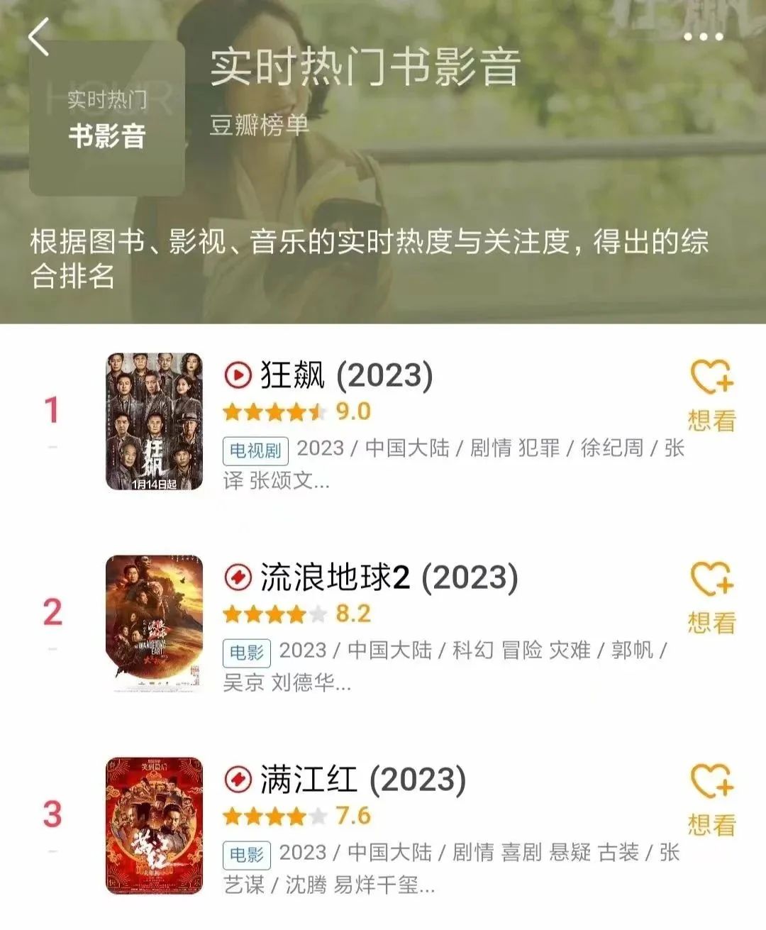 在豆瓣热门书影音榜上,《狂飙》超越《流浪的地球2》《满江红》夺得冠军,这样的反馈侧面印证了该剧成为今年国产剧第一部现象级作品的事实。