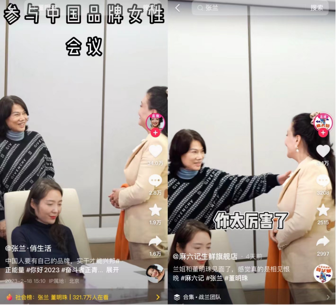 2月18日,张兰在抖音账号晒出了受董明珠之邀参观格力电器及参加中国品牌女性会议的视频。截至目前,该视频点赞数已达33万,远超她平时发布的其他视频。