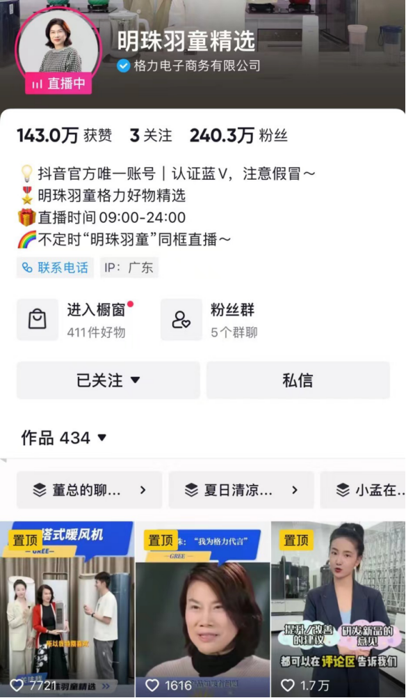 董明珠对于孟羽童的定位相当于东方甄选的董宇辉,在孟走红后,迅速开始涉足直播带货,在抖音开设“明珠羽童精选”“明珠羽童空调直播间”、“明珠羽童冰洗直播间”账号,但只有董明珠出现在直播间的时候,带货成绩才会高达千万,与东方甄选相去甚远。