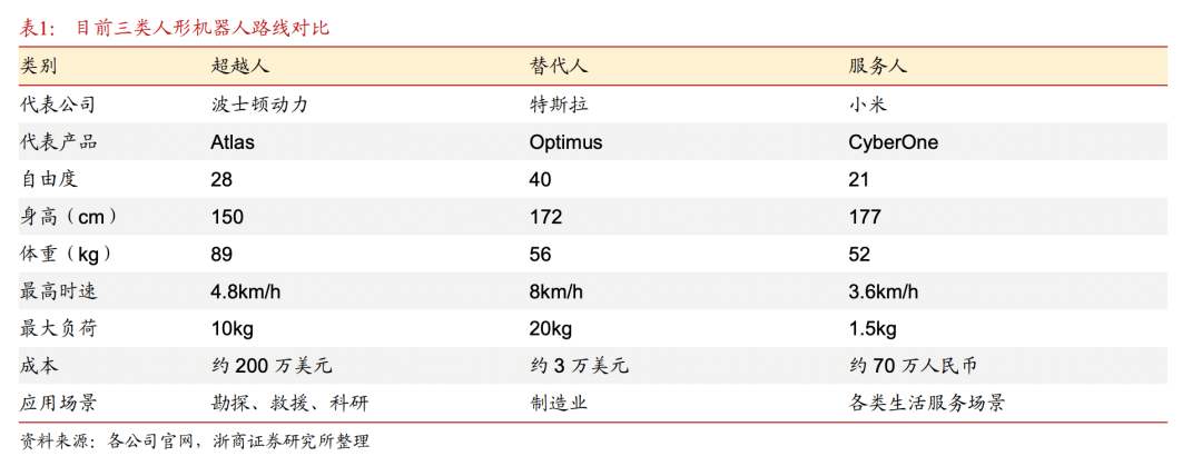 目前,人形机器人已经形成以波士顿动力为代表的超越人、以特斯拉为代表的替代人和以小米CyberOne 为代表的服务人三大主流方向。