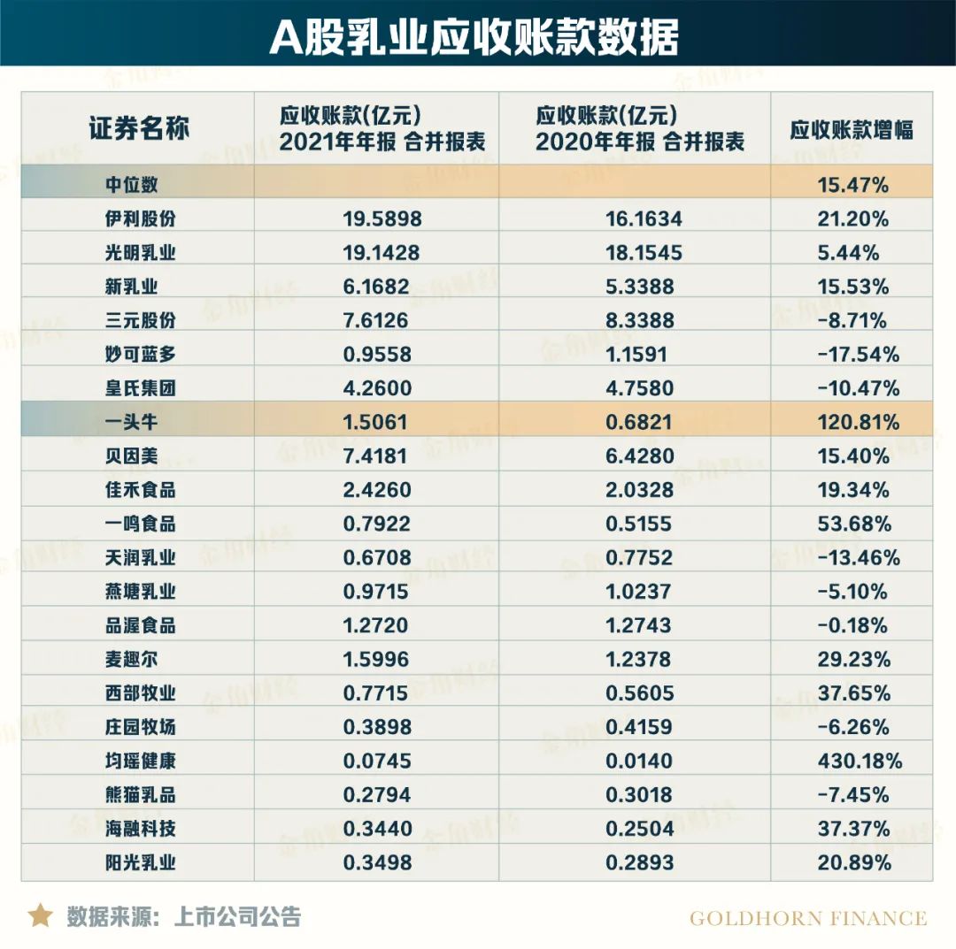 2020-2021年,营收增长下,认养一头牛的应收账款由0.68亿大幅增加至1.5亿,增幅高达120%,同期A股乳品公司的应收账款增幅中位数仅15.47%。