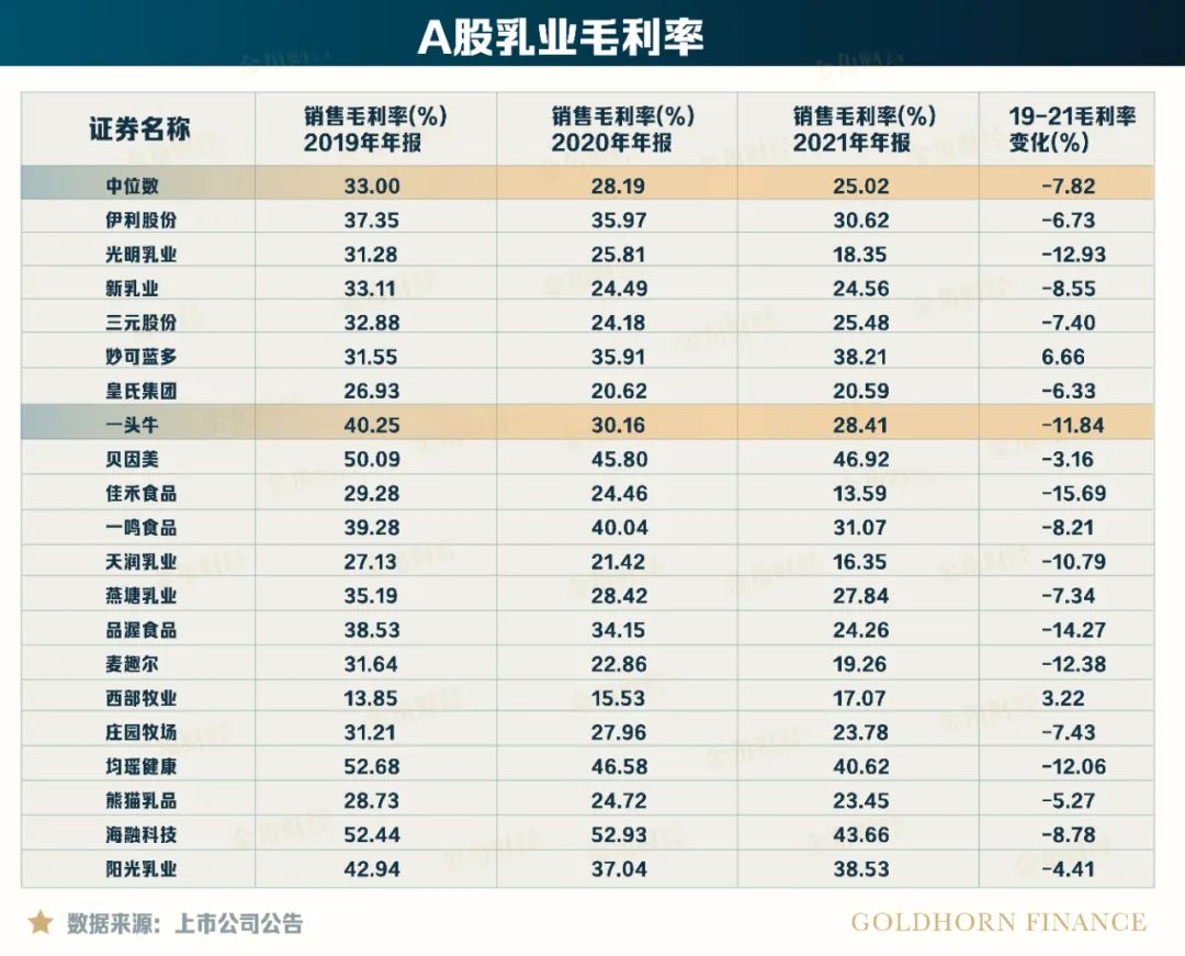 同期,认养一头牛的毛利率下跌幅度高达11.84%,而同期A股乳品公司毛利率的跌幅的中位数为7.82%,意味着认养一头牛的毛利率跌幅远高于同行。
