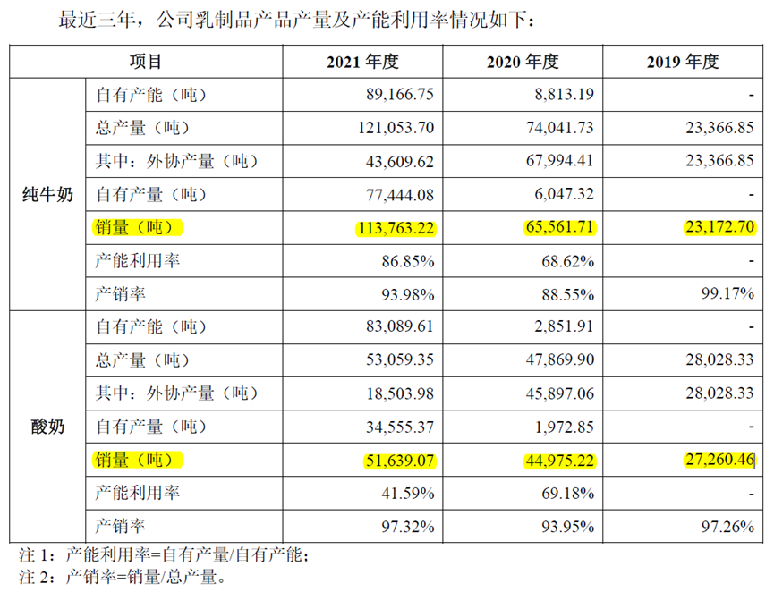 酸奶销售量为2.72万吨和4.5万吨,而招股书显示的销售量分别为2.72万吨和4.5万吨(测算出来的数值与公司披露的仅仅是小数点后三位的误差)。