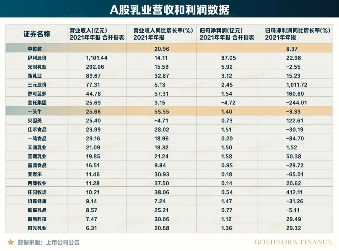 2021年,认养一头牛的营收高达25.66亿,在A股申万三级行业乳品中排名第七;营收同比增长率高达55.55%,A股乳品公司该增长率的中位数仅20.96%。