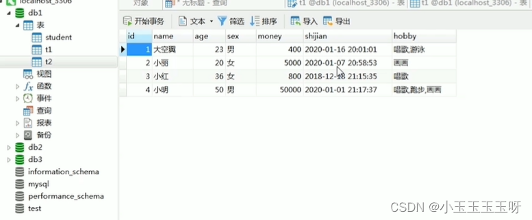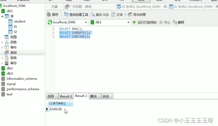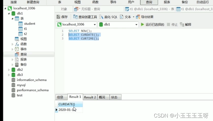 (1)显示当前时间:新建查询,这里是db1表中的时间,输入:SELECT NOW(),下面就是显示的时间。