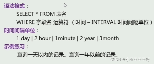 eg: 查询一天以内的记录:SELECT * FROM t2 WHERE shijian > (now() - INTERVAL 1 day);