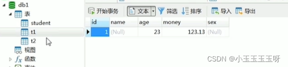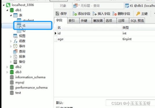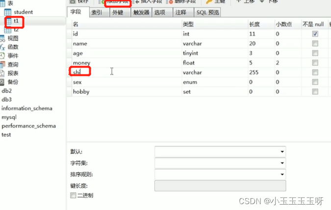接着再添加一个爱好hobby,点击t1——选择表——添加字段——输入hobby——值——添加。