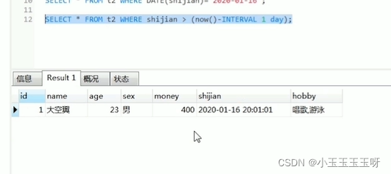 输入 select * from t2 date(shijian)='2020-01-16'; 就可以得到下图信息