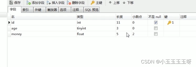 点击添加字段,名称为money,类型float,长度就是m,小数位数就是n。最后保存就可以了。