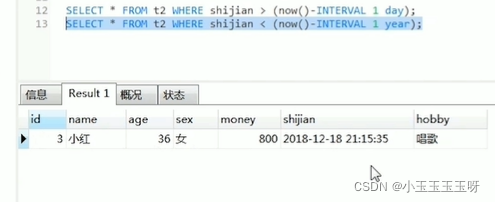 now返回的是当前的时间,INTERVAL就是间隔,减一天的时间就是得到了一天以前的这个时间,查询一天的纪录就表示对于这个一天以前的这个时间点来说,之后的一个时间,所以在这里选择大于就可以了。