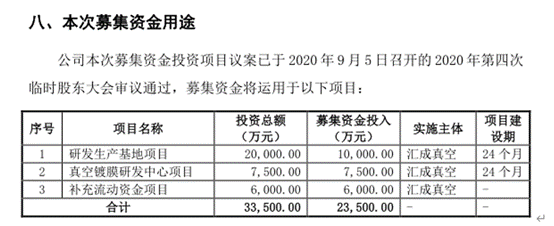 汇成真空此次欲募集23500万元,其中1亿元用于研发生产基地项目,7500万元用于真空镀膜研发中心项目。换言之,汇成真空此次IPO募资总额的74.47%用于了研发。虽然上述两个募投项目均是与研发相关,但从细分领域上看,却是为了**“扩产”**。