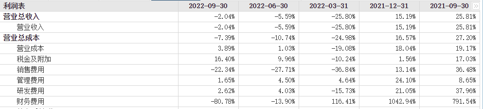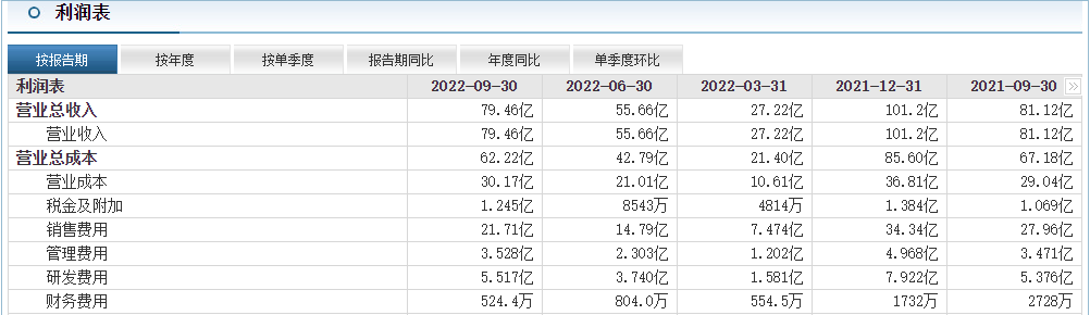细分方面,下滑最严重的是销售费用,前三季度的销售费用为21.71亿元,同比2021年的27.96亿元下滑了22.34%,2022年全年三季度,销售费用均实现了大幅下滑,第一季度同比下滑36.84%,第二季度同比下滑27.71%。