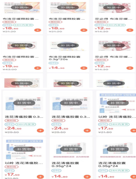 相比60元到70元左右的高价连花清瘟,低价的布洛芬缓释胶囊不约而同地都处于补货或缺货阶段,价格标准较低的连花清瘟产品同样处于断货状态。高价的药品从不缺货,低价的产品就缺货,被众多消费者质疑和诟病,所以一些电商平台近期频频遭遇网友实名举报哄抬价格。