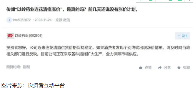 在投资者互动平台上,有投资者提问称,“传闻‘以岭药业连花清瘟涨价’,是真的吗?前几天还说没有涨价计划”。对此以岭药业回应称公司近来连花清瘟供货价格保持稳定。此外,以岭药业还表示,如果消费者发现个别终端出现涨价情形,请及时向当地相关部门进行反映。目前公司正在采取各种措施扩大生产,全力保障市场供应。