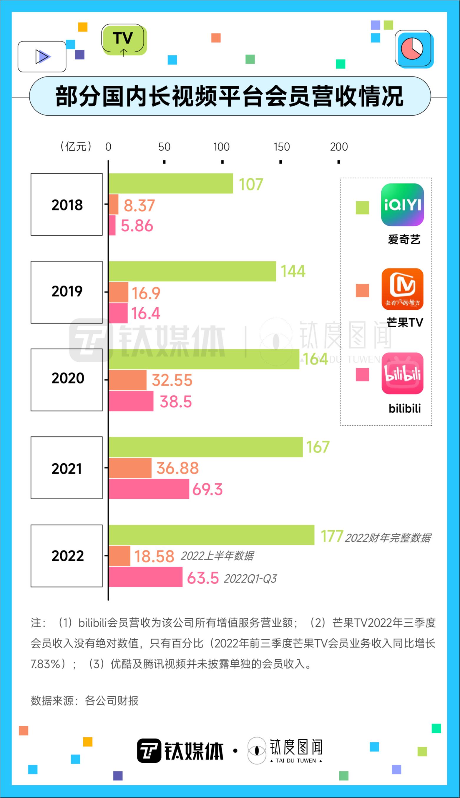 2022年,三大视频平台会员营收均实现增长。爱奇艺2022全年会员服务营收177亿元,创历史新高,较2018年增长65.4%;2022年前三季度,因bilibili大会员等增值服务用户数量增加,bilibili会员营收所属的增值服务营业额同比增长26.3%,达63.5亿元;2022年上半年,芒果TV会员业务实现营业收18.58 亿元,同比增长6.48%。